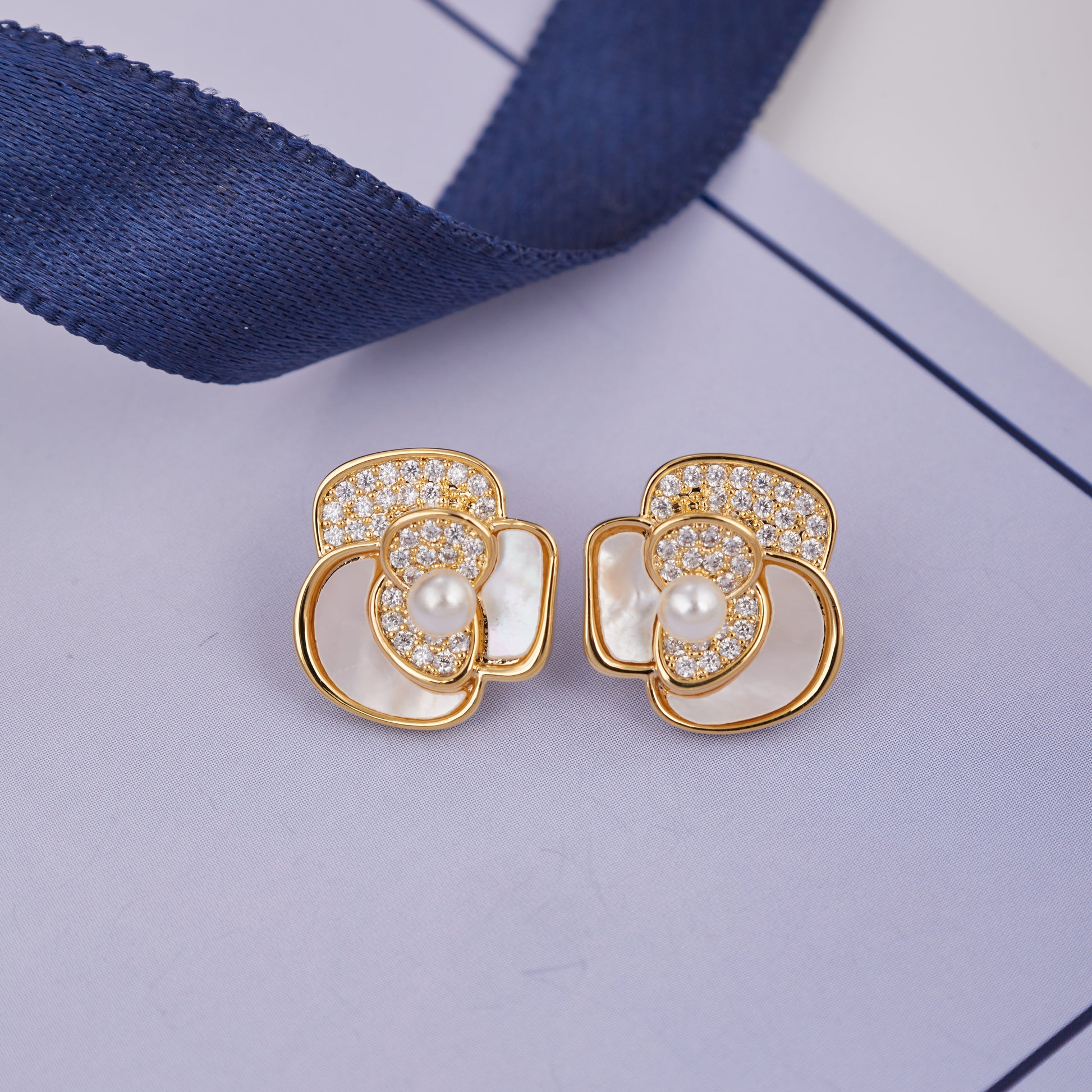 Mother-of-pearl petals with sparkling stones for an effortlessly graceful look.
