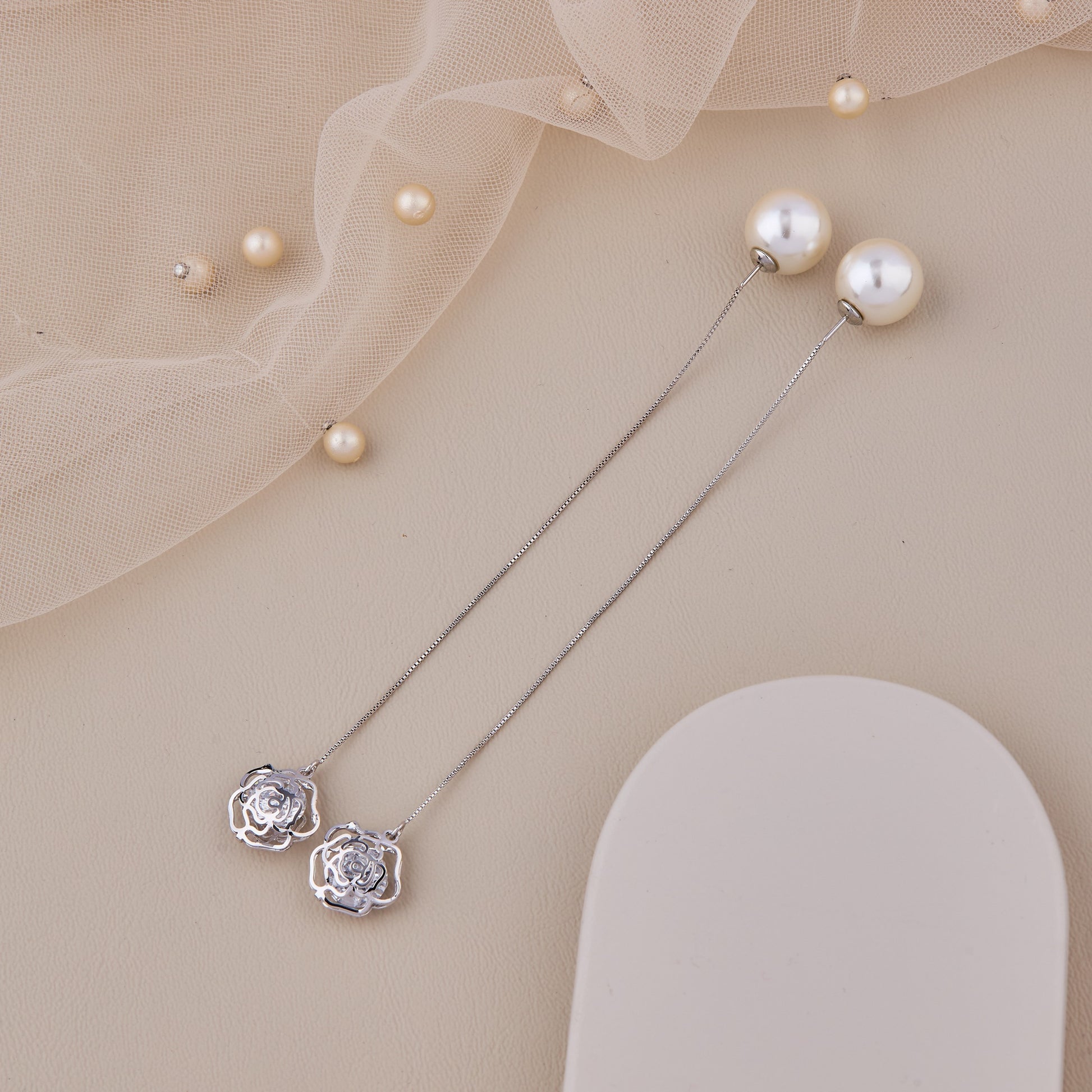 The Earrings feature an elegant pair adorned with lustrous pearls, blending sophistication and style in a timeless design. Perfect for a variety of occasions, these fashion accessories enhance any outfit with their graceful charm. Displayed in an indoor setting, the presentation complements their artistic appeal and delicate craftsmanship, making them a standout piece of jewelry.