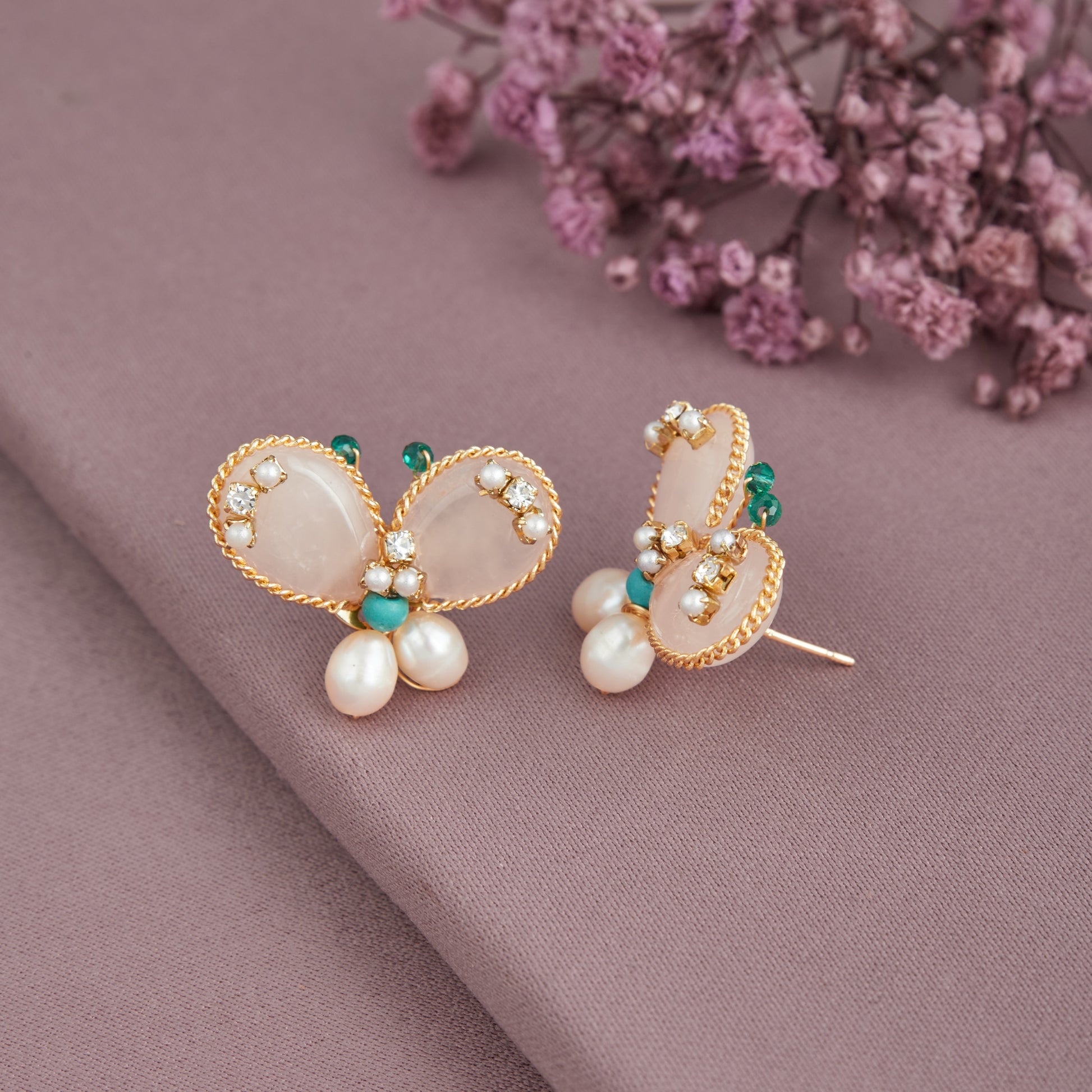 a pair of earrings crafted with pearls and delicate floral elements, enhanced by subtle gemstones. As fashionable accessories, they beautifully merge elegance with nature-inspired design, making them perfect for adding charm and sophistication to any indoor occasion.