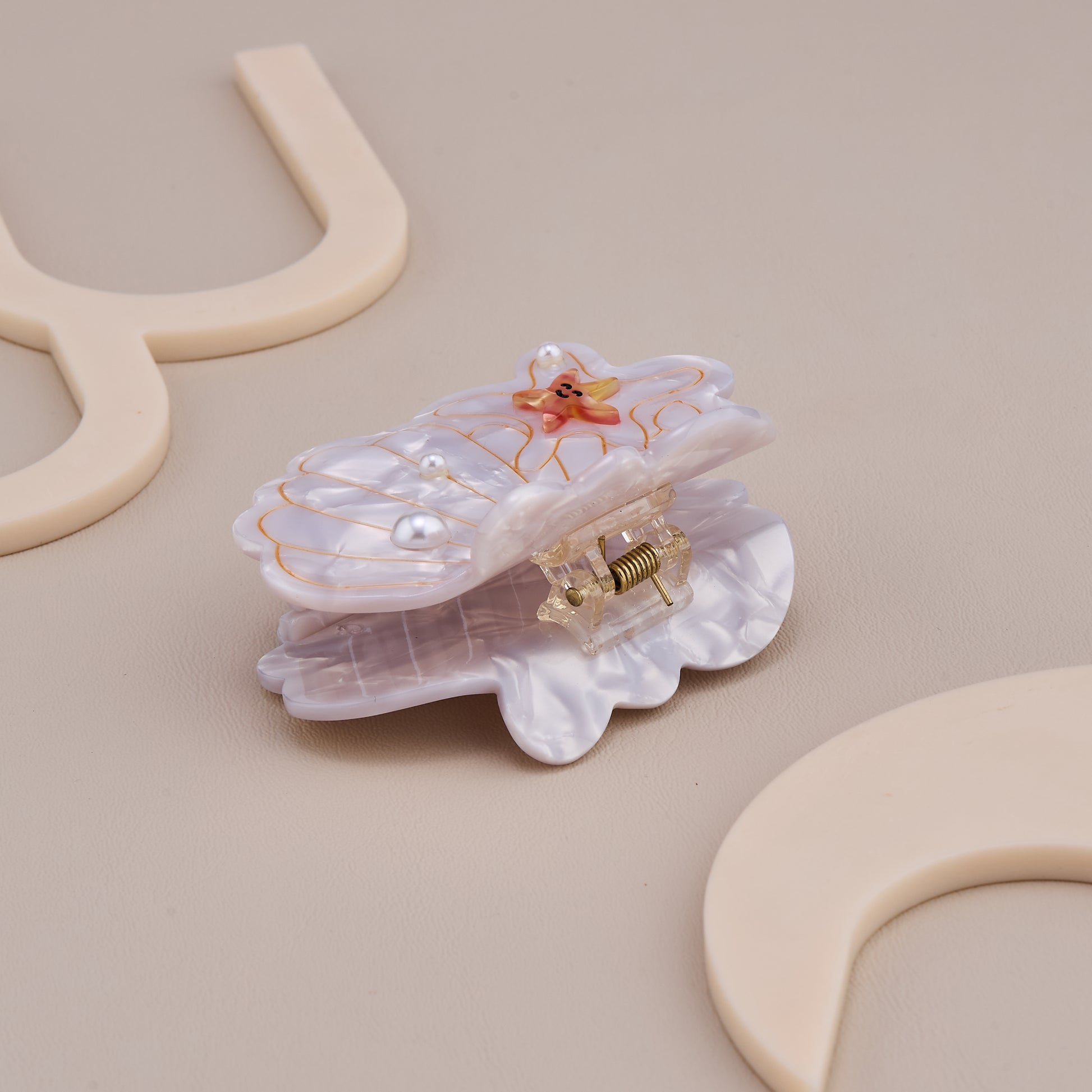Elegant seashell-inspired hair claw clip featuring a pearly finish, delicate gold detailing, and a cute starfish accent. Made from premium acrylic for a strong yet gentle hold, it adds a touch of ocean charm to any hairstyle. Perfect for parties, casual outings, or gifting to someone who loves unique and classy accessories.