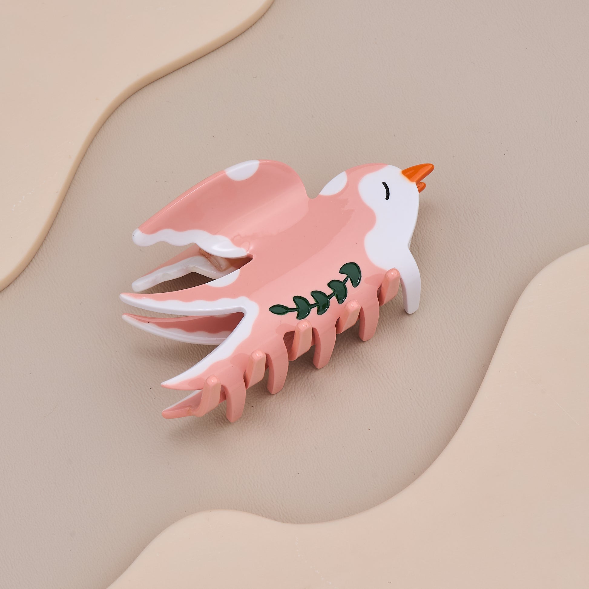 Charming bird-shaped hair claw clip in soft pink and white tones with cute detailing. Crafted from durable acrylic for a secure and gentle grip, it adds a whimsical touch to your hairstyle. Perfect for casual wear, parties, or gifting to someone who loves unique and playful accessories.