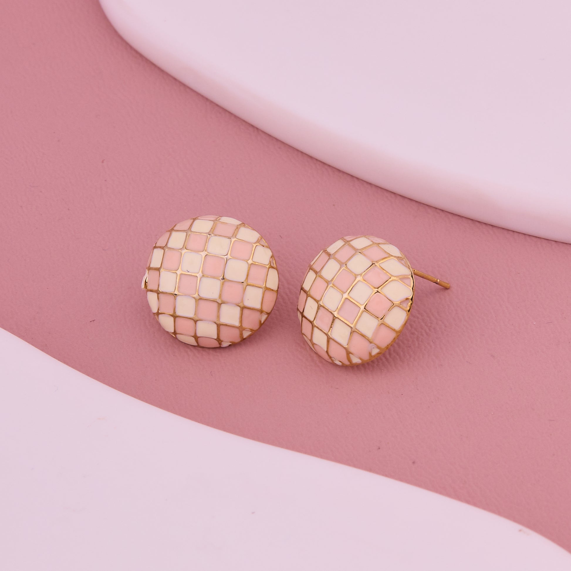 Pink & Gold Checkered Dome Stud Earrings