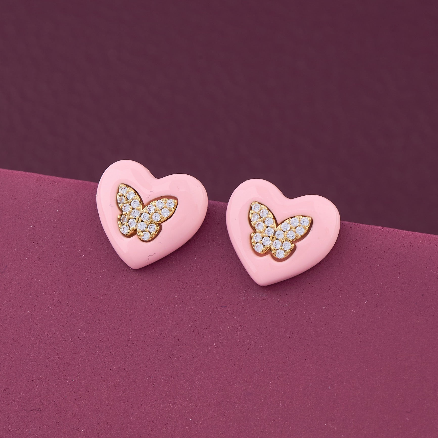 The Earrings features a pair of pink heart-shaped earrings adorned with sparkling diamonds. Each earring combines a romantic heart motif with an intricate butterfly design, creating a delicate and whimsical aesthetic. These elegant pieces are perfect for those who appreciate jewelry that blends charm, elegance, and a touch of fantasy.