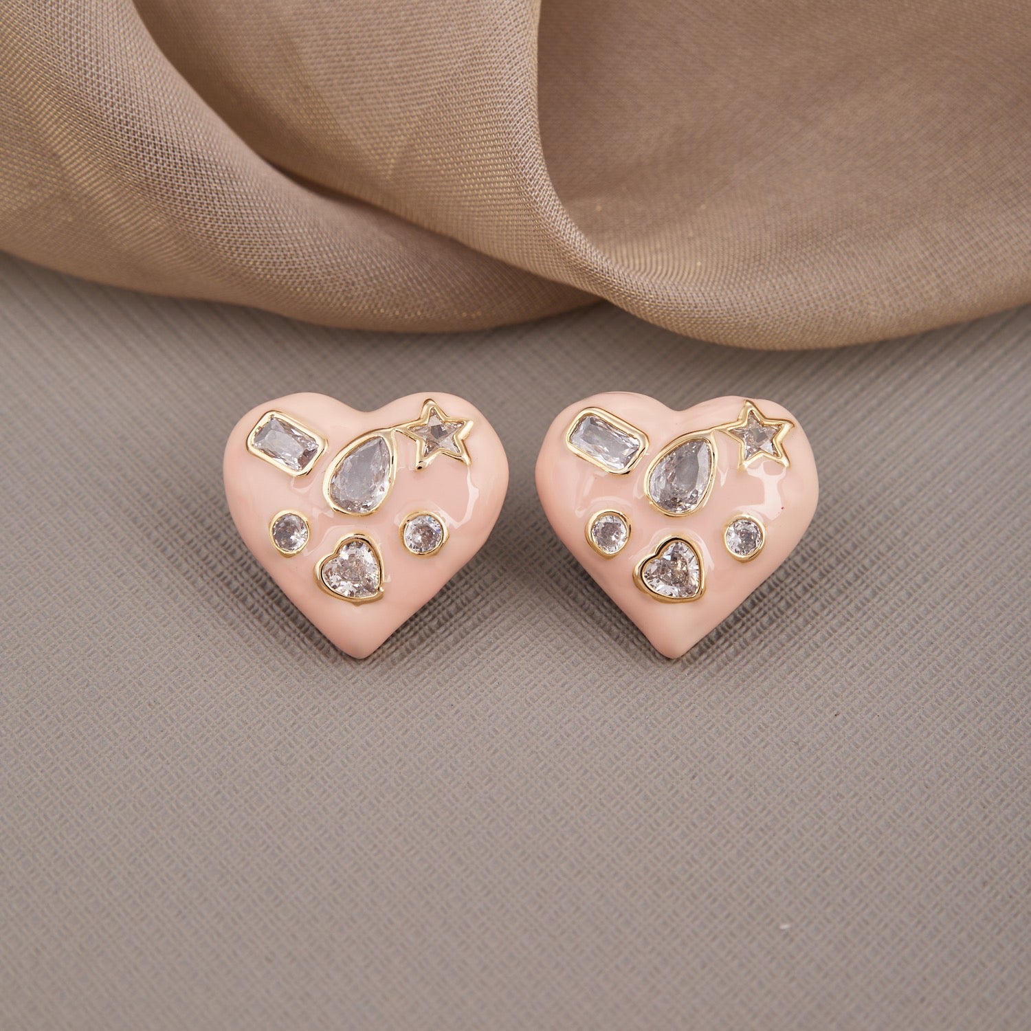 The Earrings feature a charming pair of pink heart-shaped earrings embellished with sparkling diamonds and delicate star motifs. These fashionable accessories combine playfulness with elegance, making them a perfect choice to elevate any outfit. Their intricate design and shimmering details stand out beautifully.