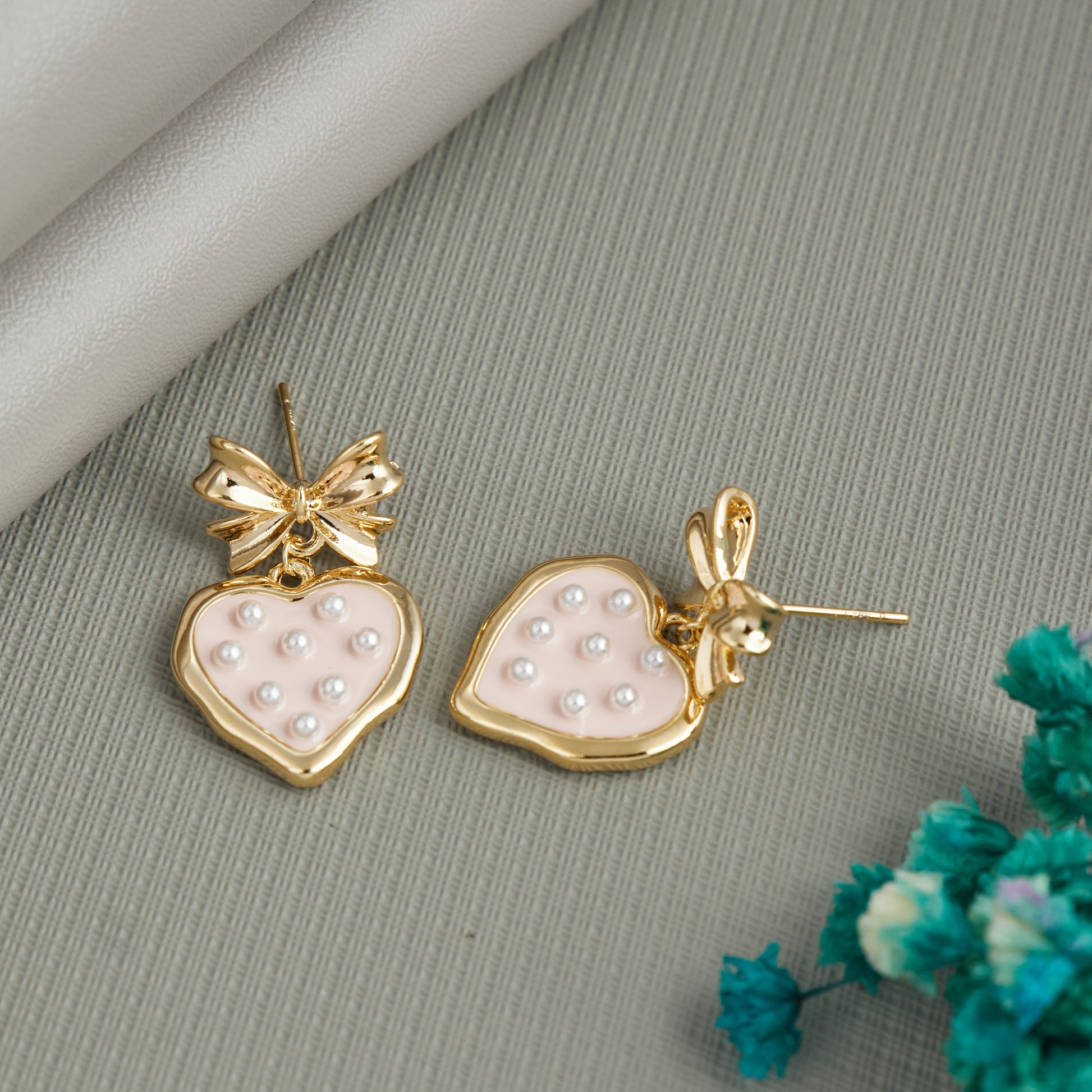 Adorable pink heart earrings with pearl accents and a shiny golden bow. Perfect for gifting, parties, or adding a cute touch to your everyday outfits. Lightweight and stylish design.