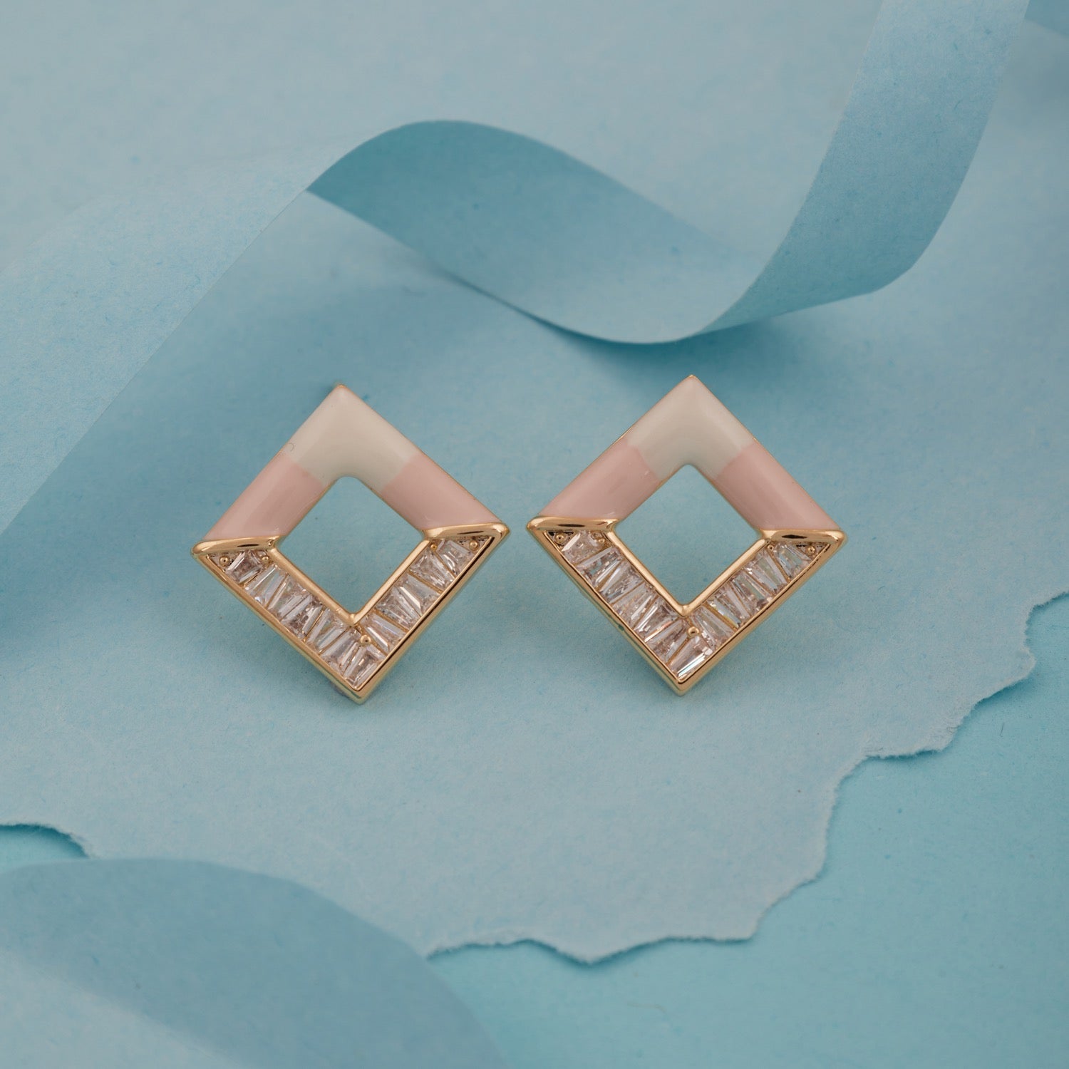 Chic rhombus-shaped stud earrings with pink-white enamel and shimmering crystals. Lightweight and elegant, perfect for party, casual, or office wear.
