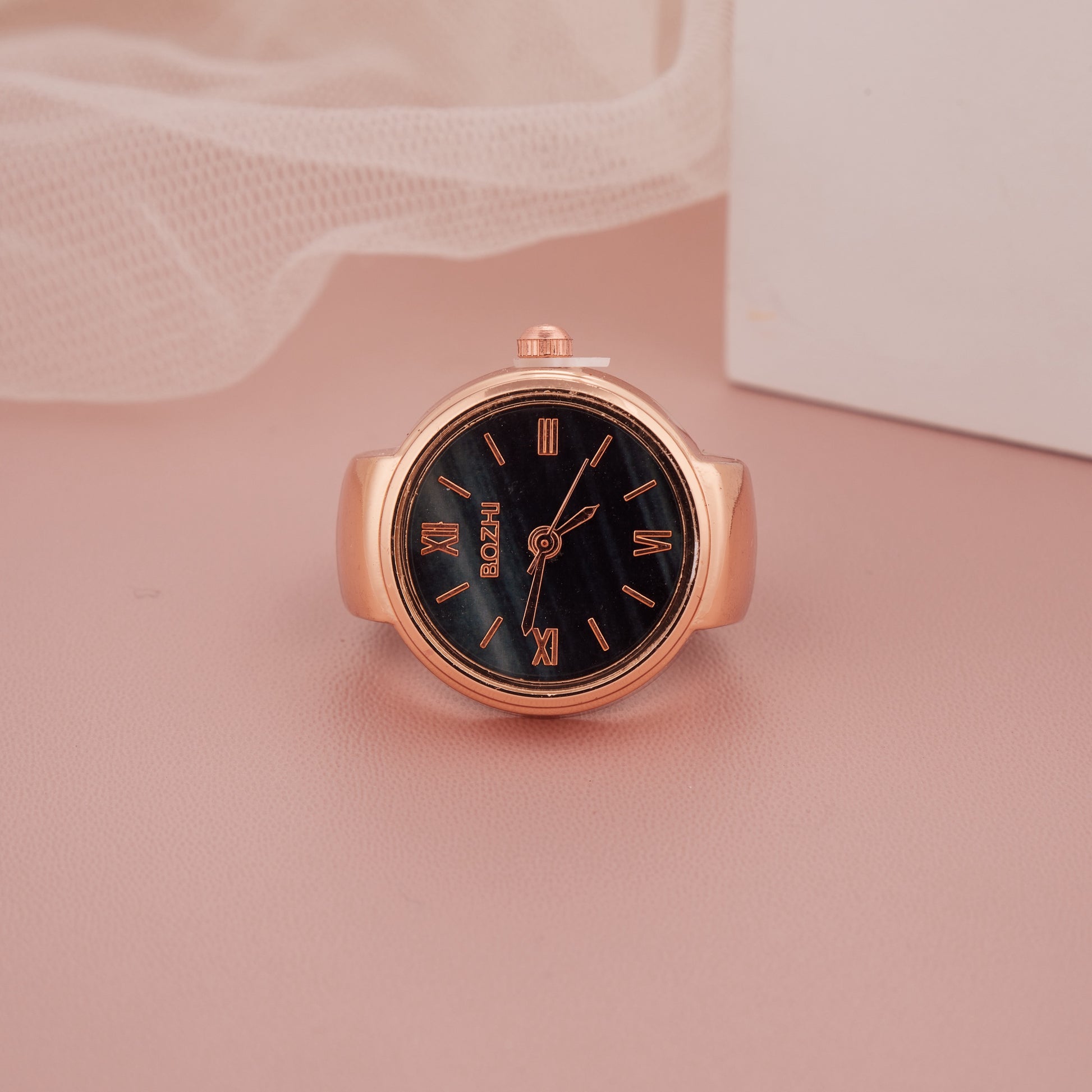 Rose Gold Ring Watch with Black Roman Dial