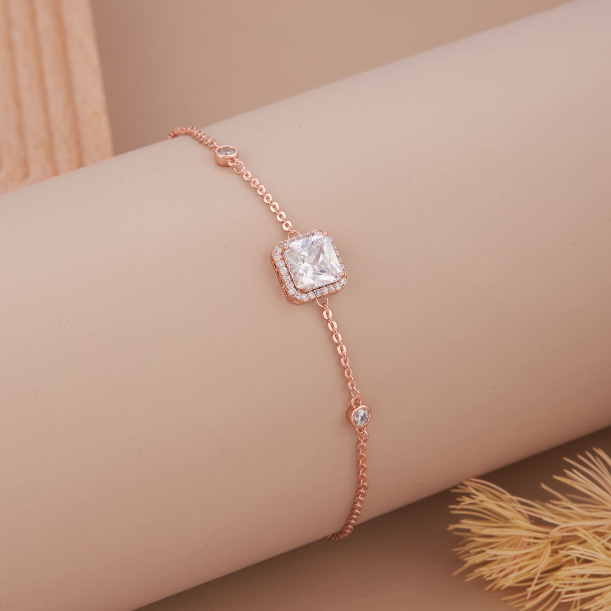 Elegant rose gold wraparound bracelet made from stainless steel and embellished with sparkling American Diamonds. A timeless piece designed by GC Premium Jewellery for modern Indian fashion.