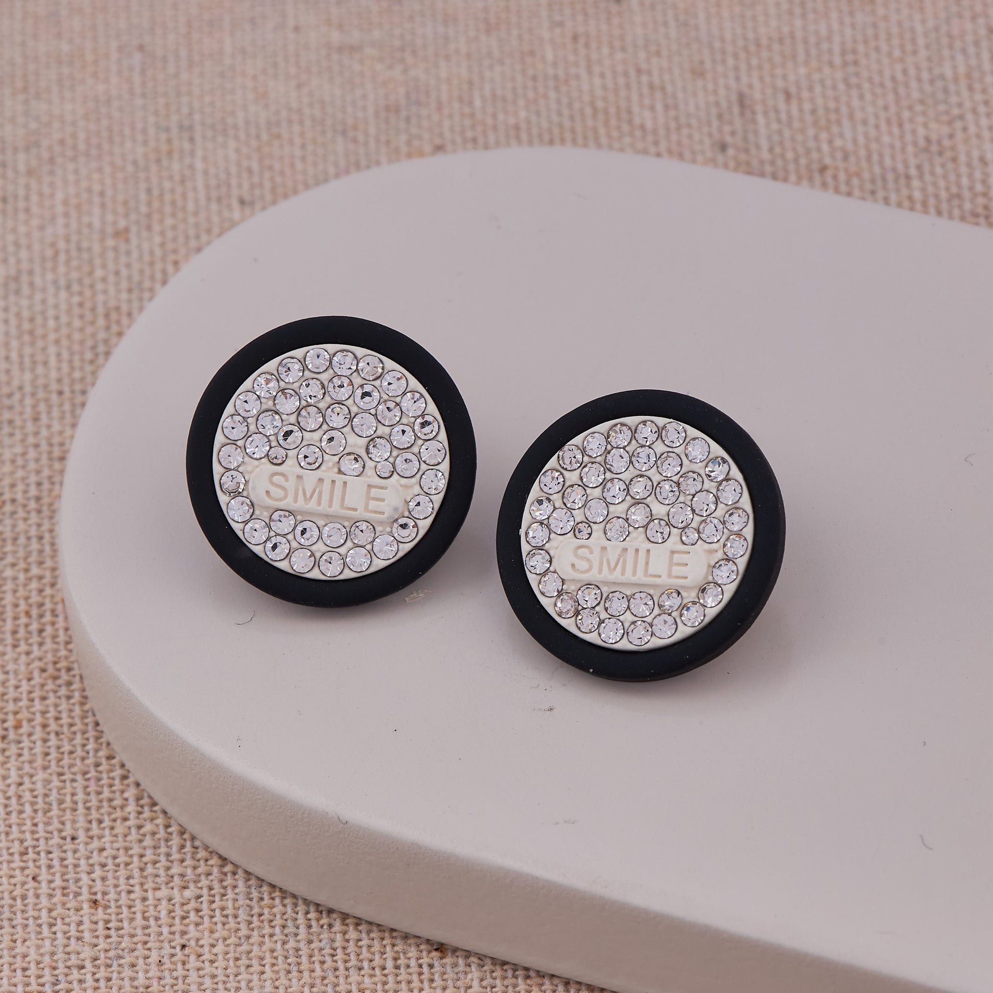 The Earrings features a pair of round earrings adorned with sparkling diamonds. Displayed on a brown surface, the setting enhances their brilliance and elegance, making them a sophisticated addition to any jewelry collection.