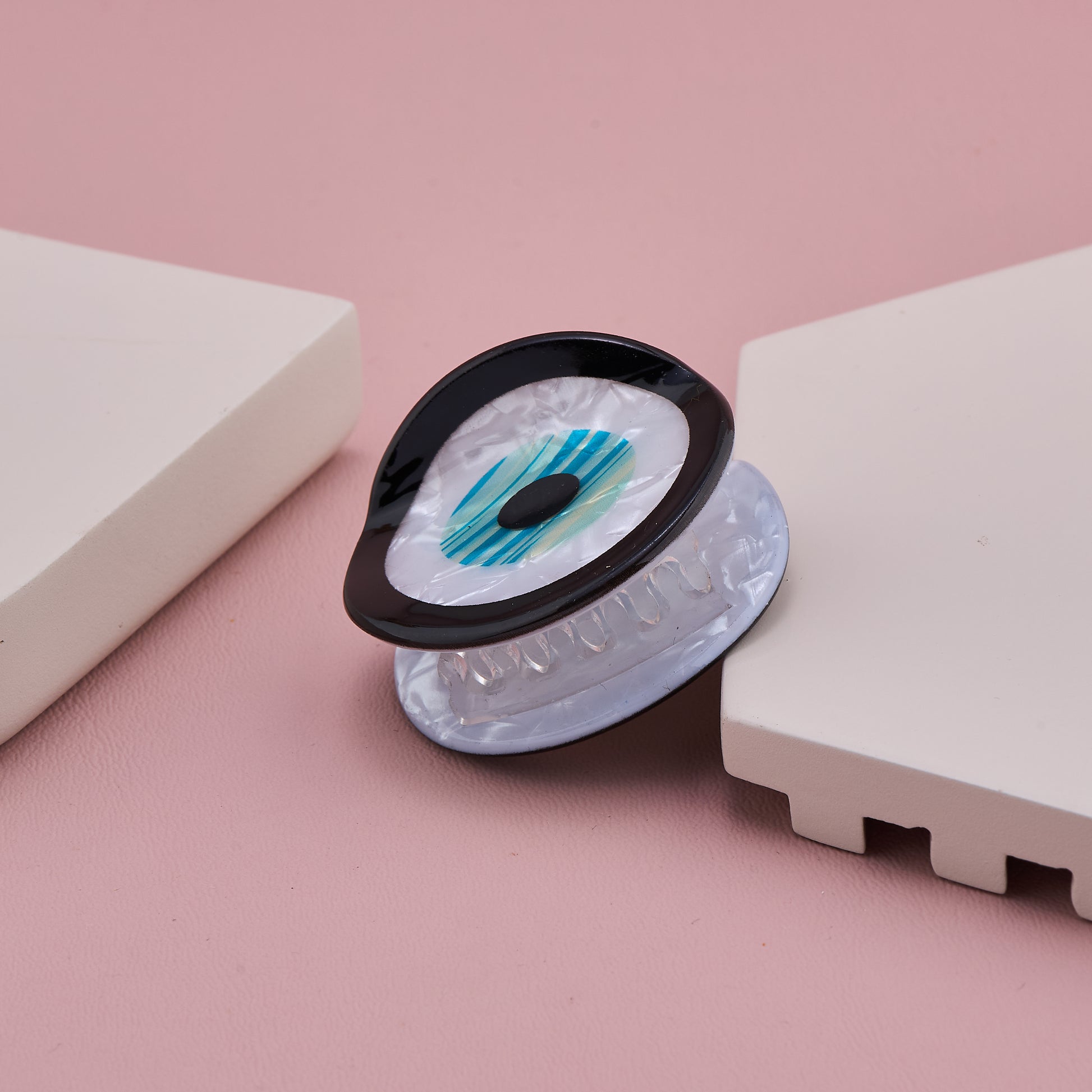 Protect your style with this trendy Evil Eye-inspired acrylic hair claw clip. Designed with a glossy round shape and a beautiful mix of black, white, and blue tones, it adds a modern and meaningful touch to any hairstyle. The sturdy spring mechanism ensures a firm hold, making it both functional and fashionable. Perfect for everyday wear, special occasions, or as a lucky charm accessory.
