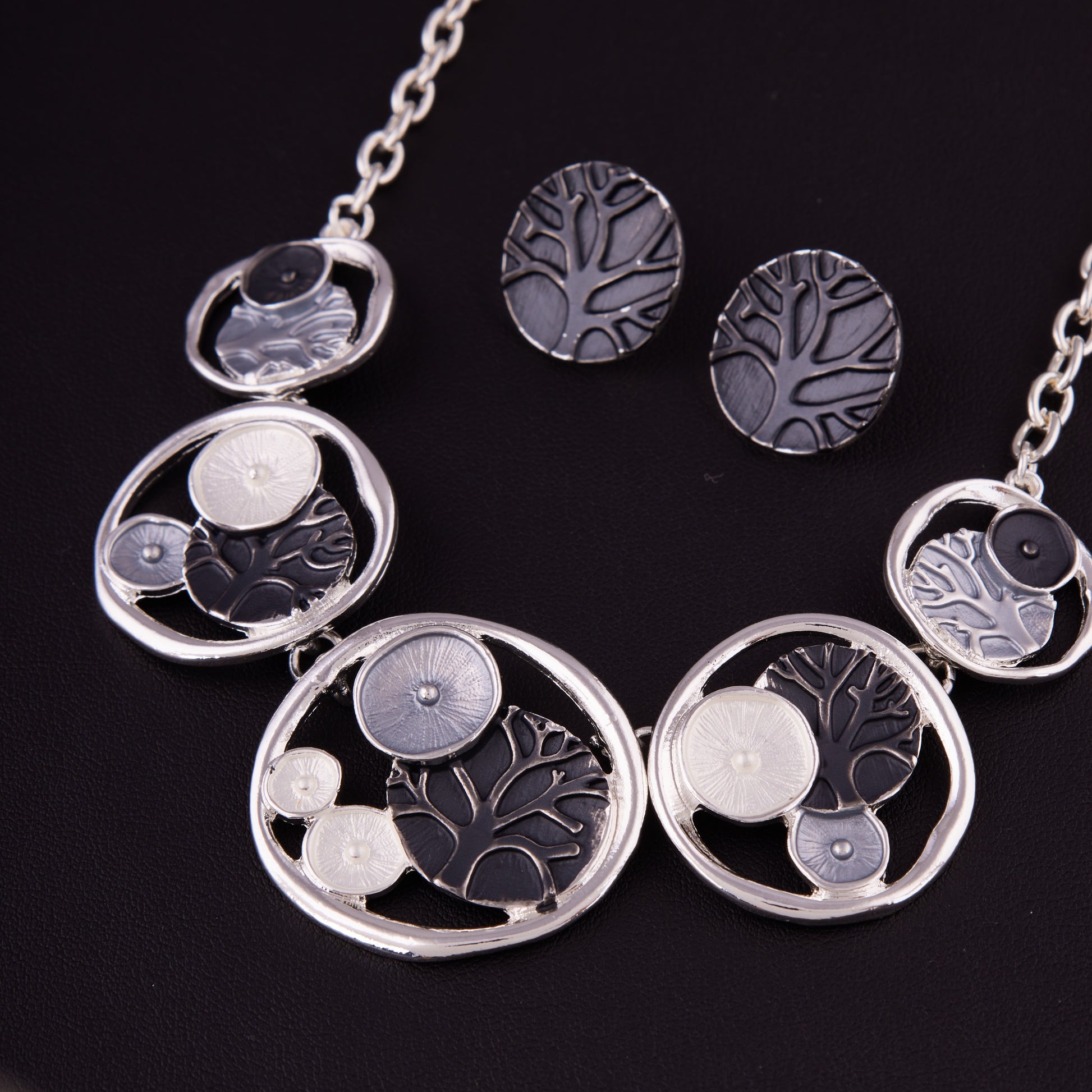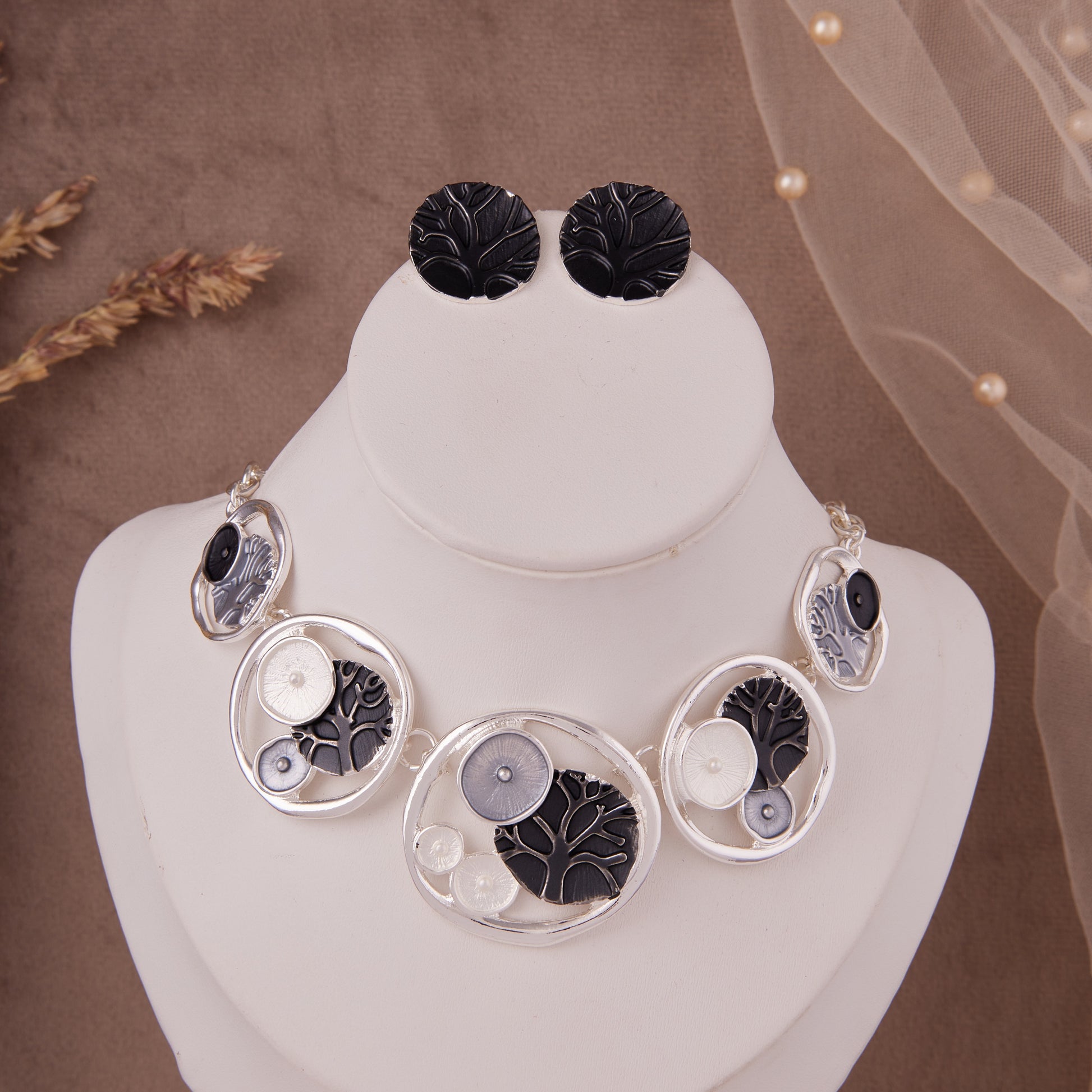 Black & Silver Tree Motif Necklace Set with Matching Stud Earrings for Women