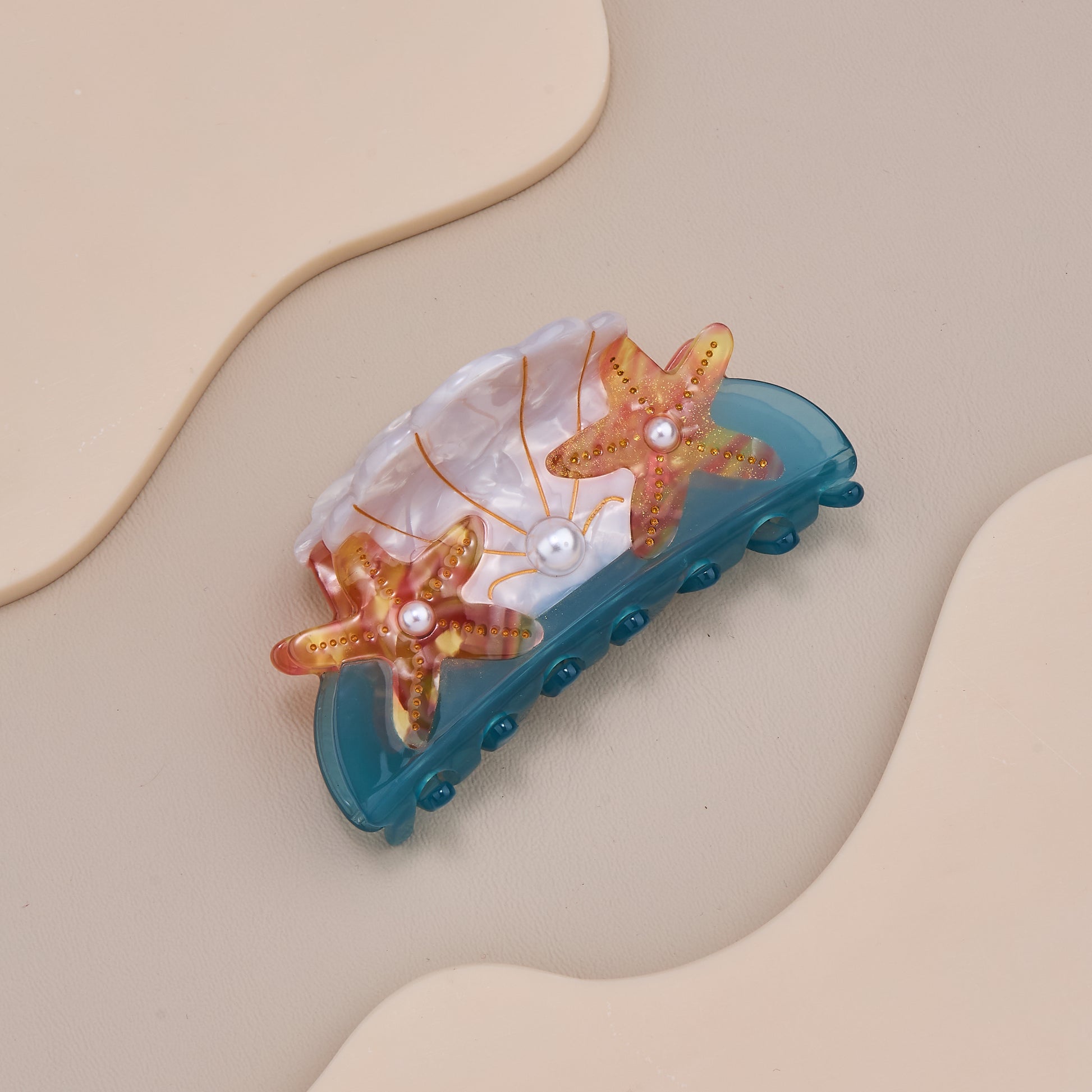 Beautiful ocean-themed hair claw clip featuring a pearly seashell design adorned with starfish and pearl accents. Made from durable acrylic with a glossy blue base, it offers a secure and comfortable hold. Perfect for beach days, vacations, or adding a coastal touch to your everyday hairstyle.