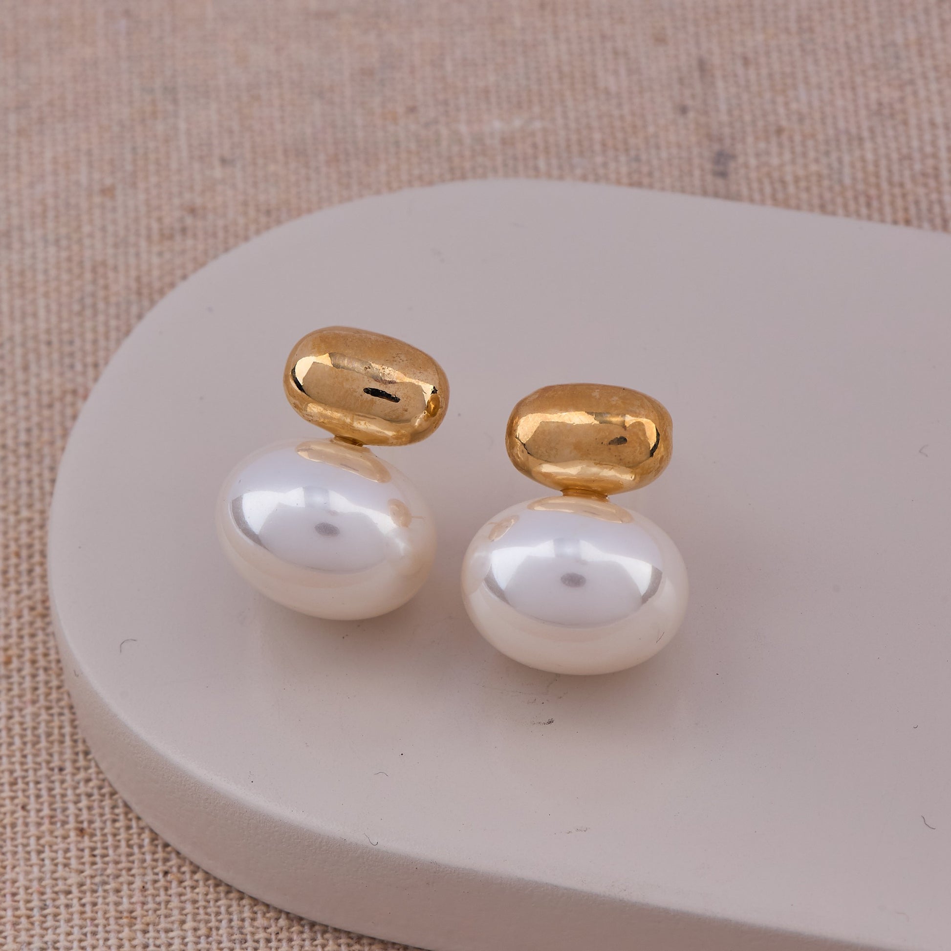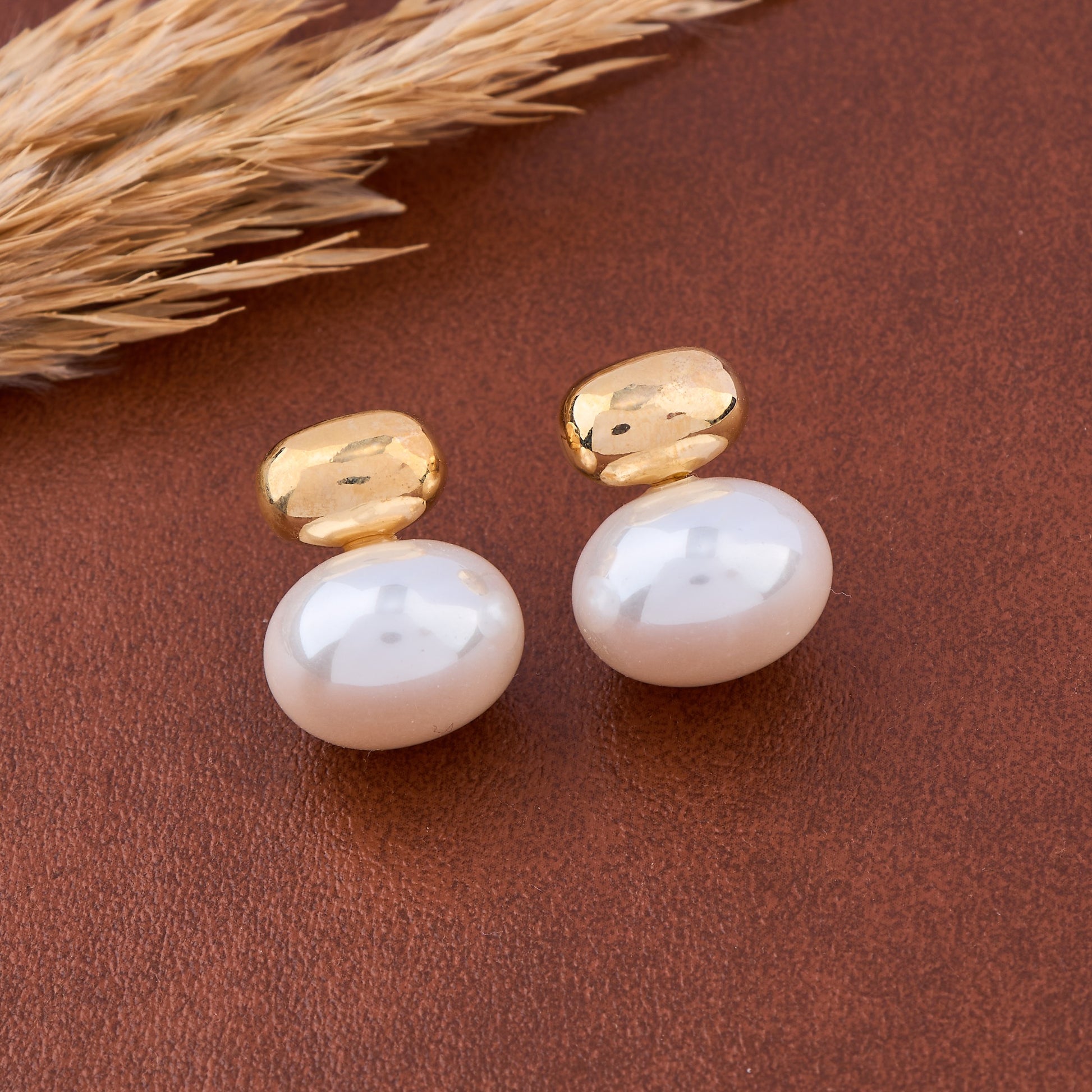 These earrings showcase a pair of sophisticated pearls set in an elegant design. Resting on a brown surface, their natural luster and refined craftsmanship make them a timeless piece of jewelry, perfect for adding a touch of elegance to any occasion.