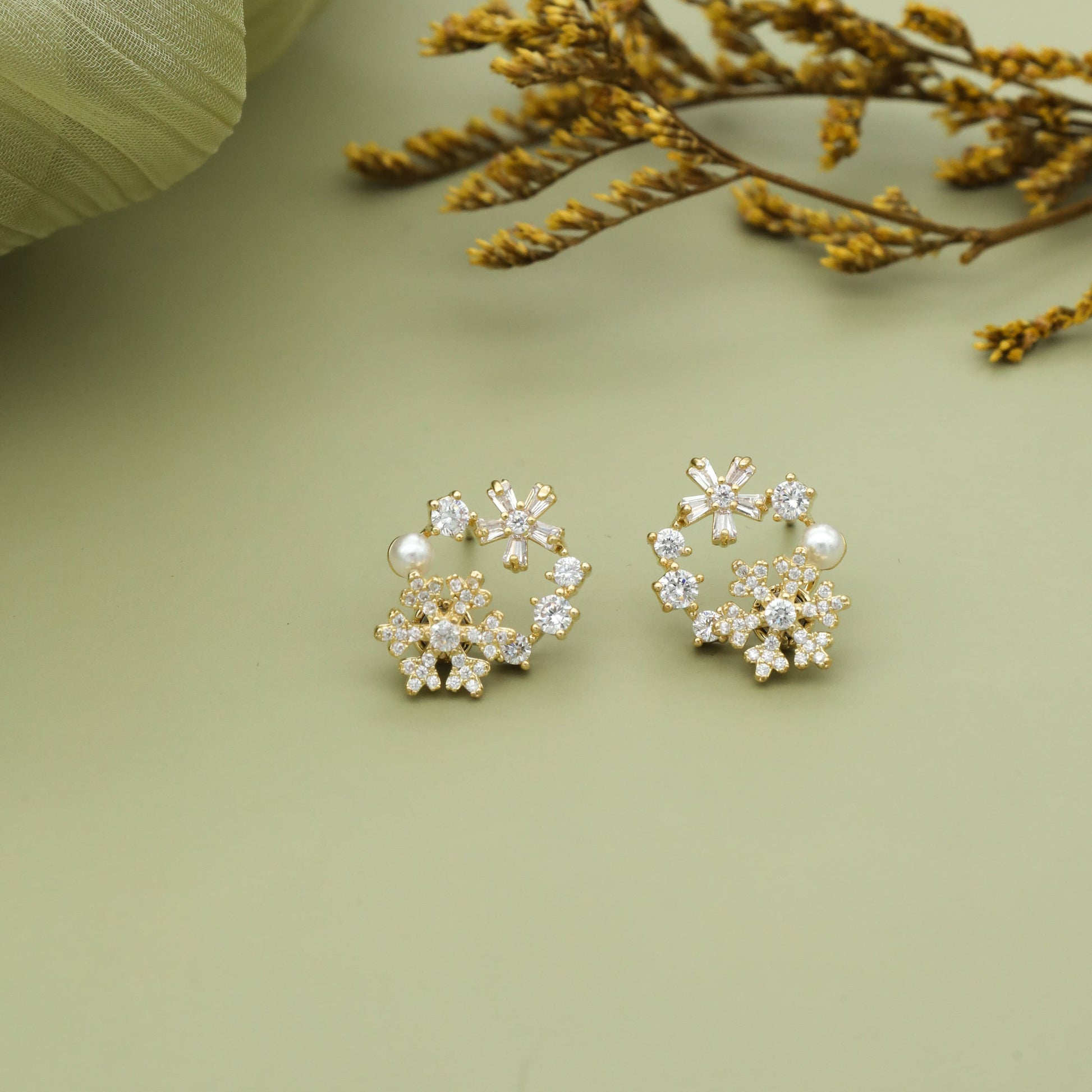 These exquisite stud earrings feature a delicate wreath of sparkling crystals shaped into floral motifs, accented with a single luminous pearl. Their graceful and refined design makes them a perfect choice for weddings, parties, or adding a touch of elegance to any outfit.