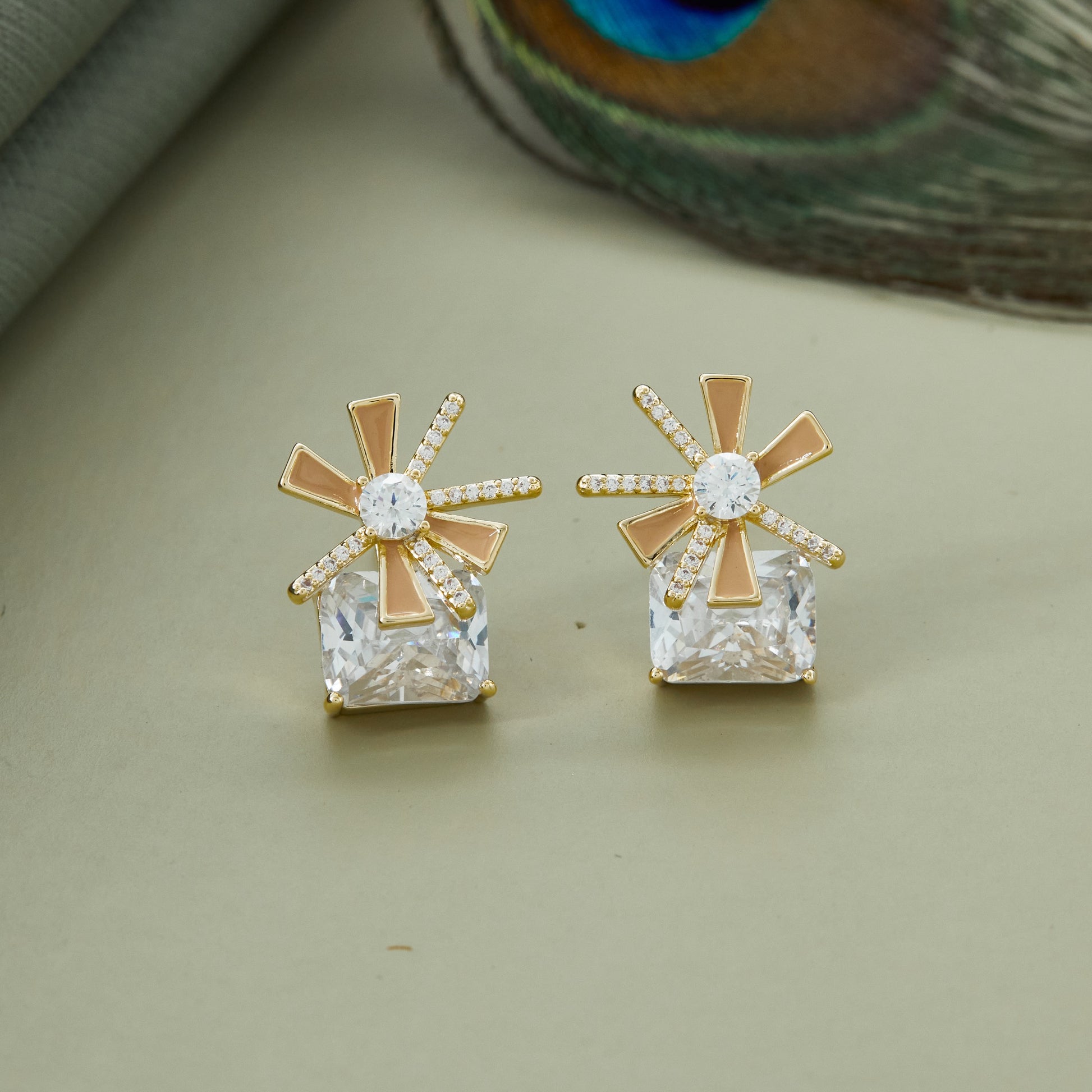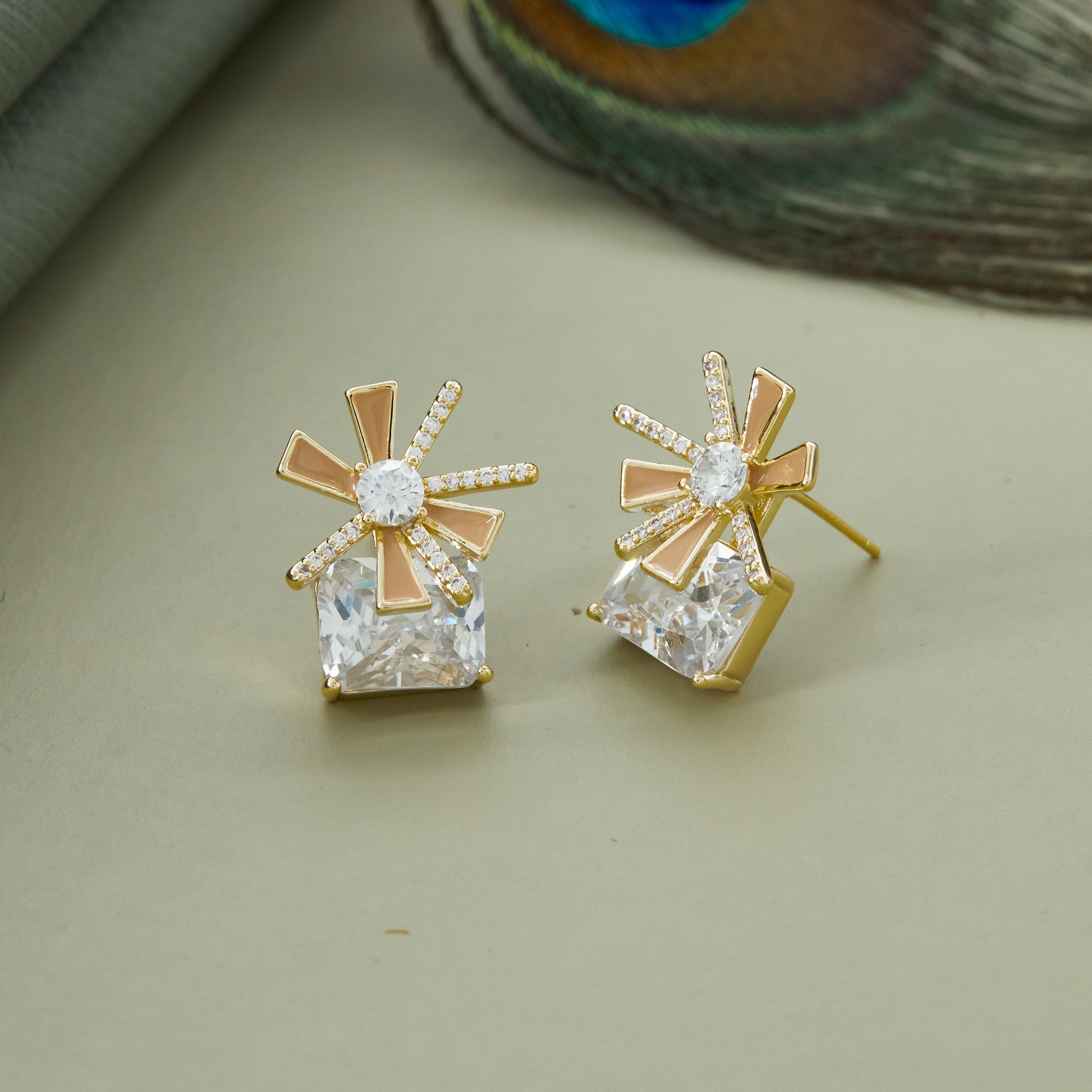 These elegant earrings feature a striking starburst design adorned with sparkling crystals. The combination of geometric gold elements and brilliant stones creates a modern, glamorous accessory, perfect for adding a statement touch to any outfit.