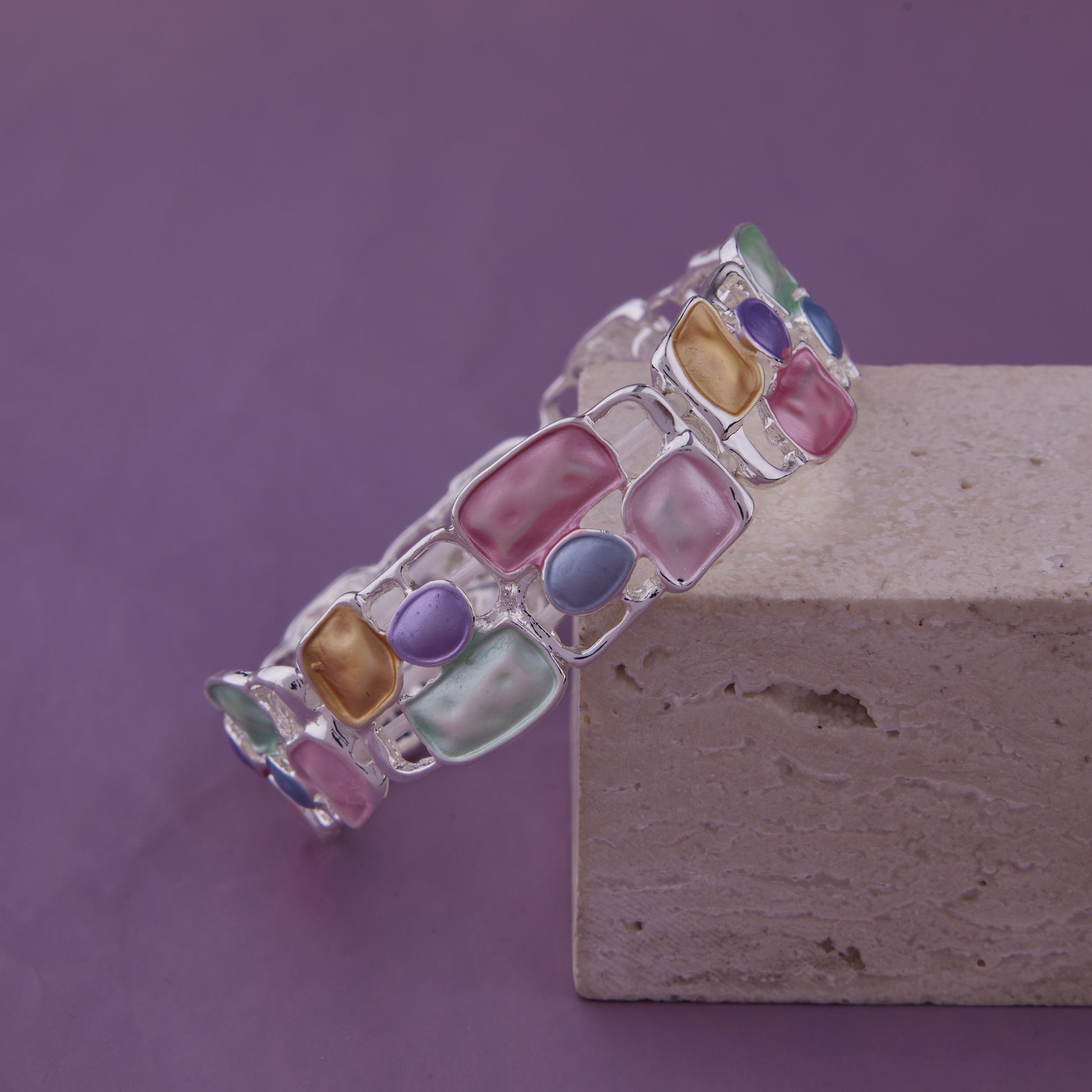 Beautifully displayed on a rich purple surface, this bracelet stands out with its sleek design and modern elegance. Perfectly suited for indoor settings or fashion-forward occasions, this accessory enhances any outfit with subtle charm. Its versatile look makes it ideal for daily wear or special moments where style speaks for itself.