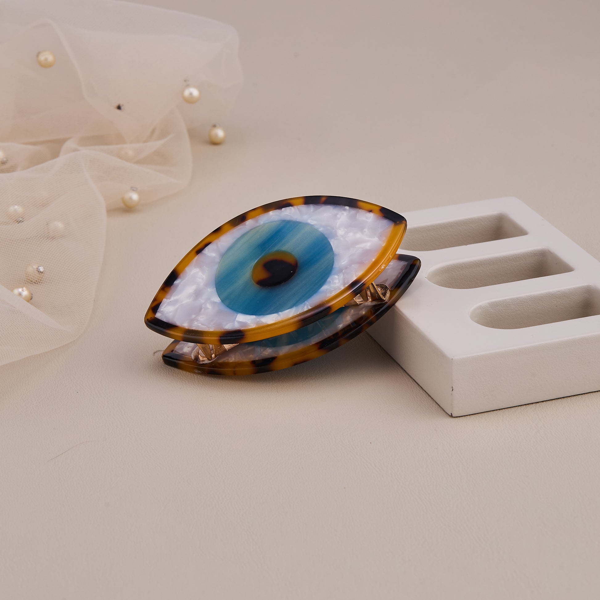 Trendy evil eye-inspired hair claw clip with a tortoise-shell border and glossy marble finish. Crafted from high-quality acrylic for durability and a strong, secure grip. Adds a bold and stylish touch to your look while symbolizing good luck and protection — perfect for everyday wear or special occasions.