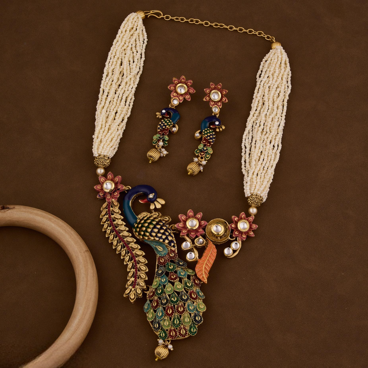 Traditional Peacock Design Necklace & Earrings Set with Pearls