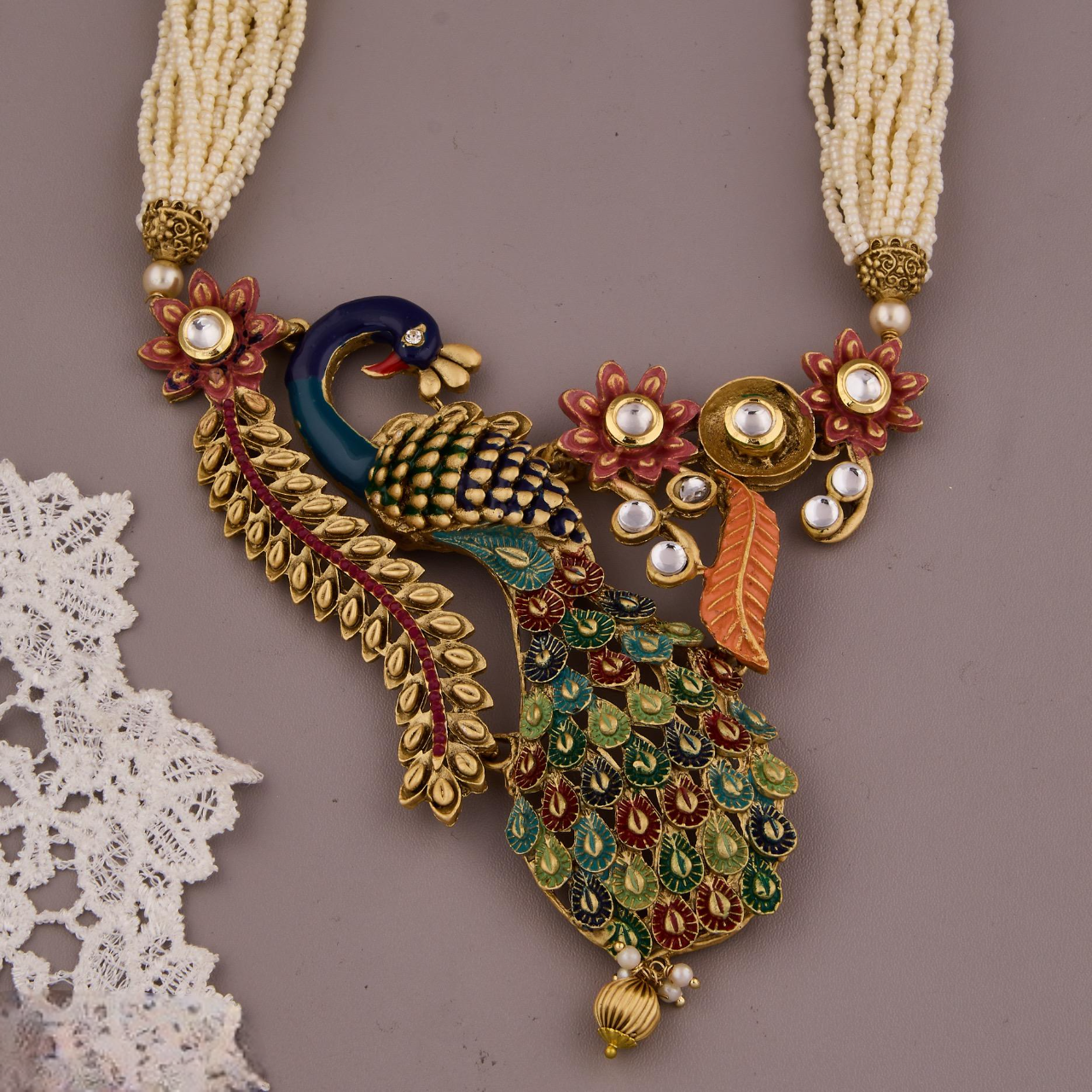 Elegance and culture to your collection with this exquisite handcrafted jewellery set, featuring a statement peacock motif necklace and matching earrings. Designed with intricate enamel work, studded stones, and pearl strands, this set embodies royal Indian craftsmanship and festive charm.