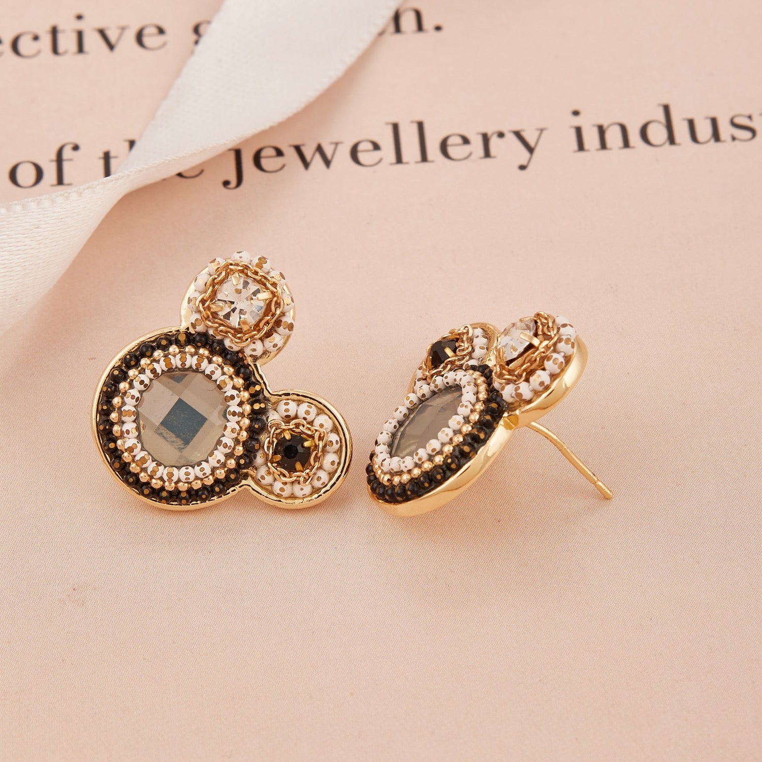 Unique stud earrings featuring a trio of interconnected circles, each adorned with faceted crystals, golden thread, and black-white beaded borders for a bold and artistic look.