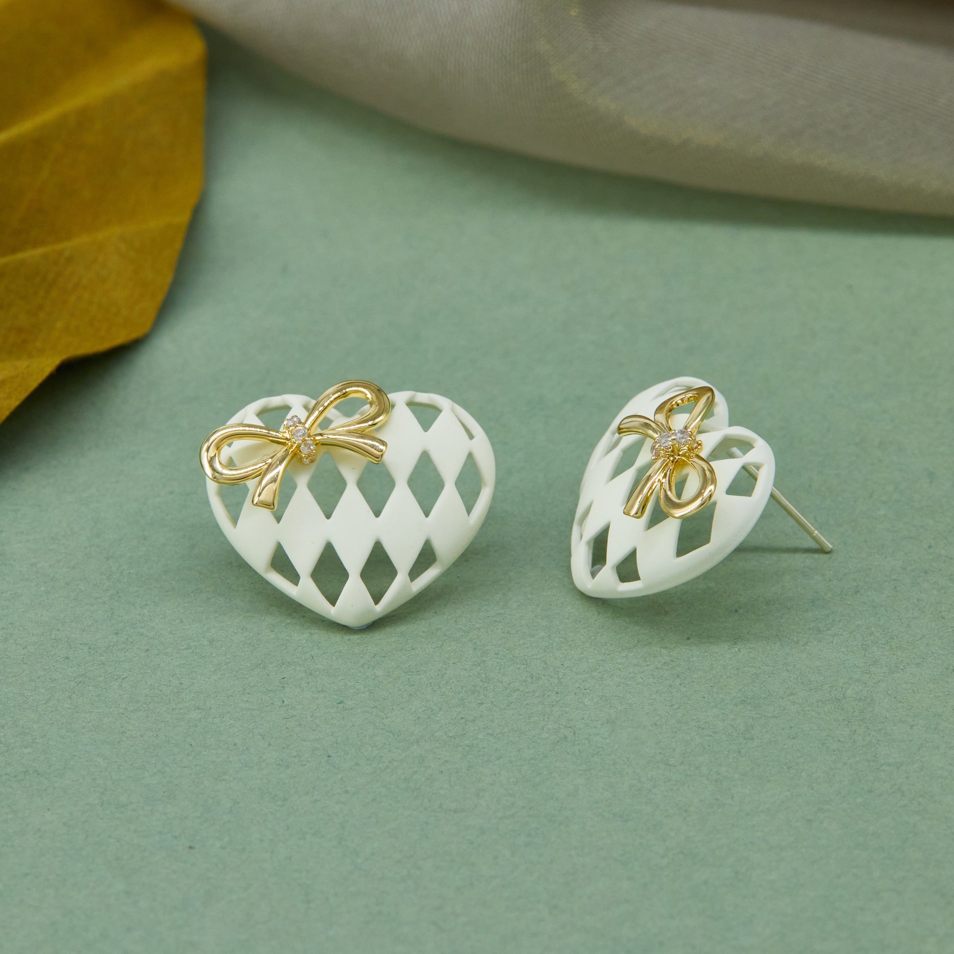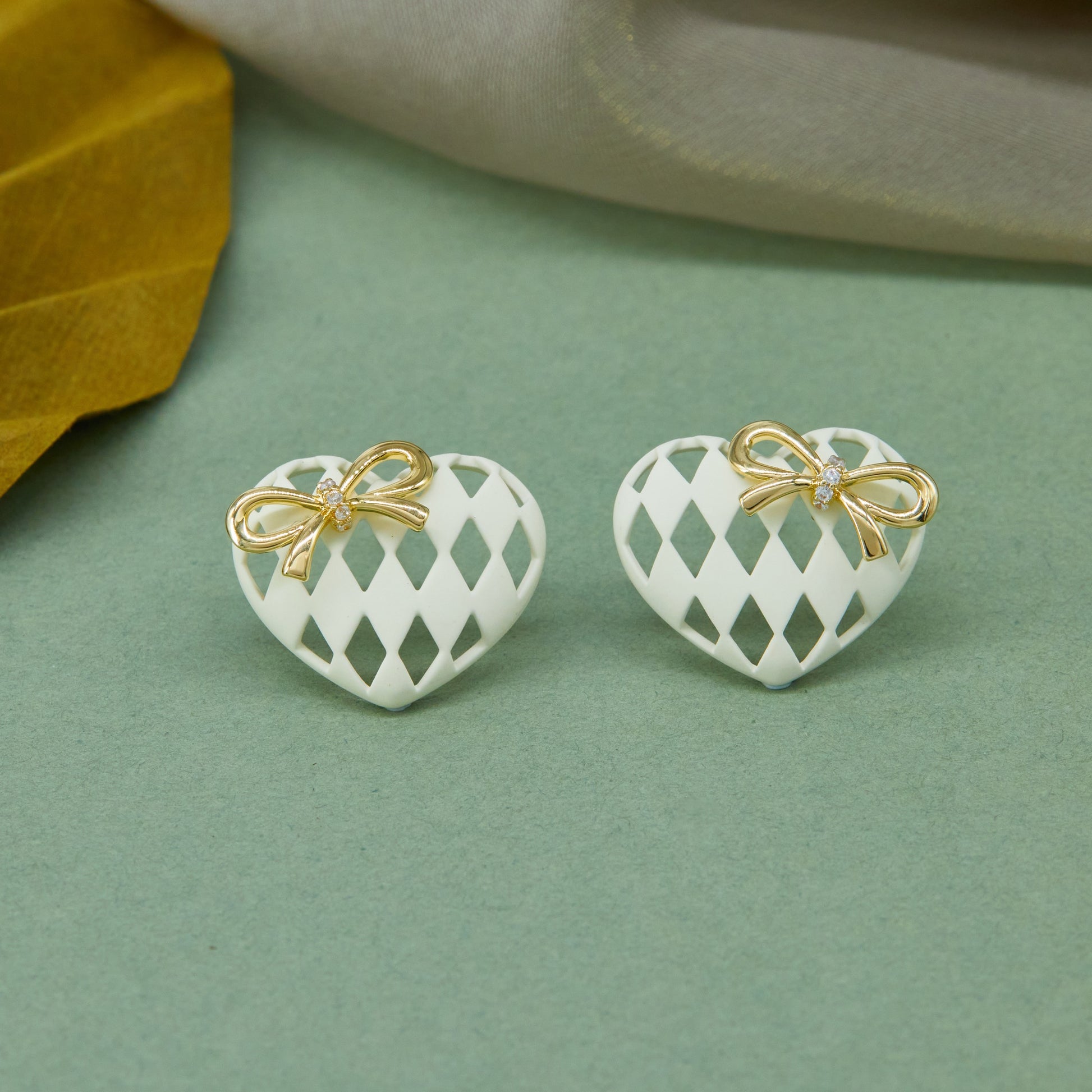 The earrings feature a pair of adorable white heart-shaped accessories, expertly crafted from enamel for a smooth, shiny finish. Their playful yet elegant design makes them a charming addition to any jewelry collection, perfect for adding a touch of whimsy and sweetness to any outfit.