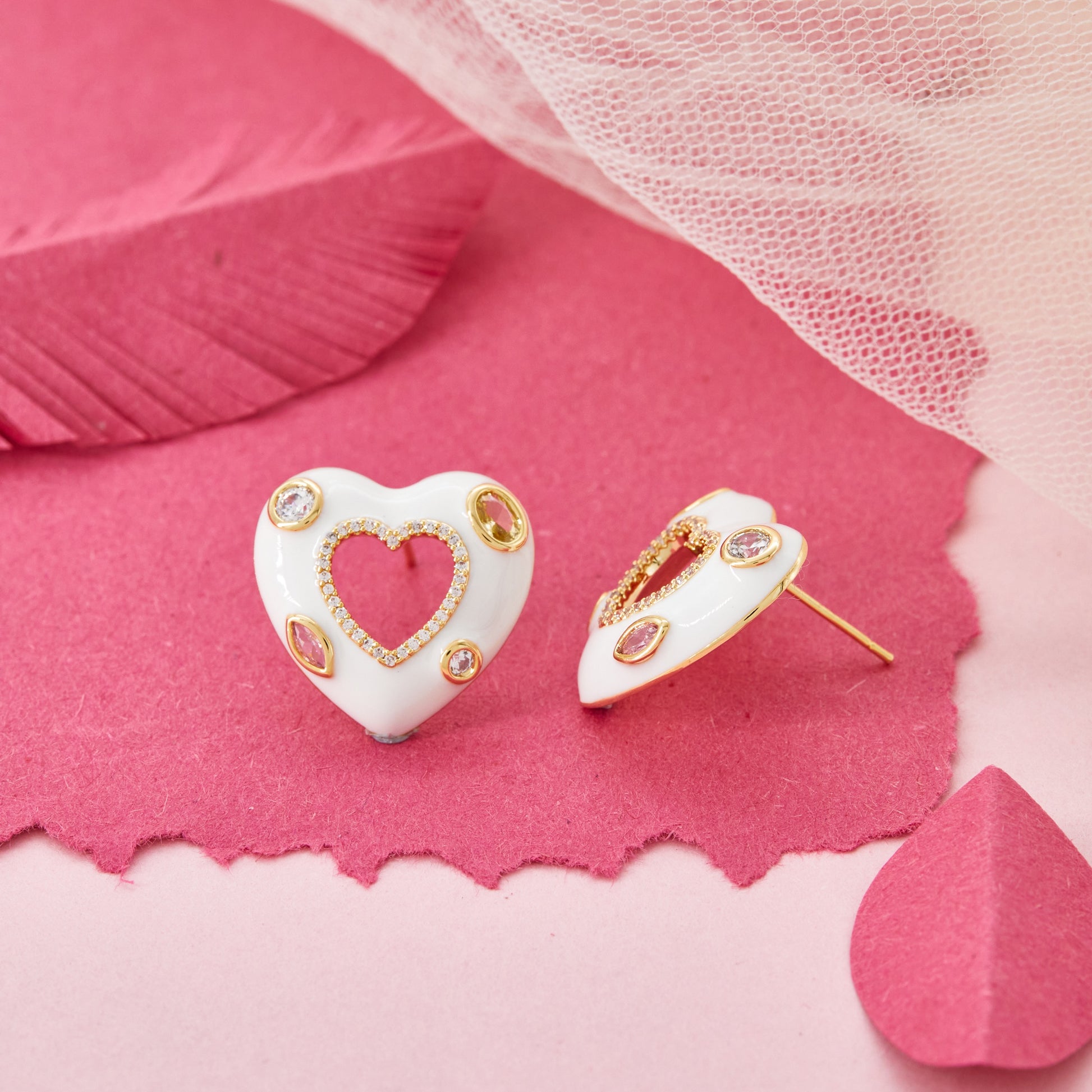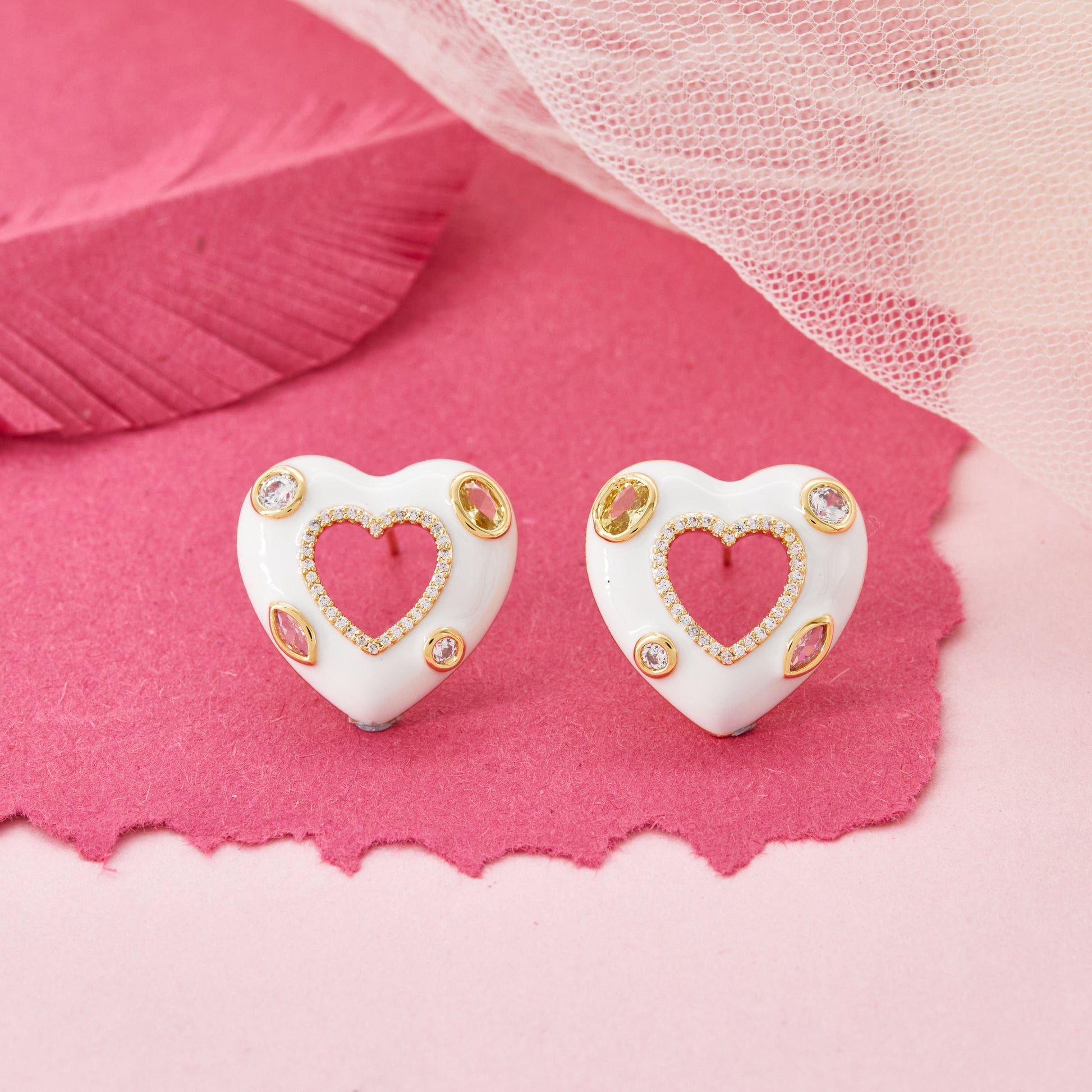 These charming earrings feature a white heart-shaped design with a sparkling cutout at the center, outlined with delicate crystals. Accented with colorful stones set in gold, they offer a playful yet elegant look, perfect for adding a touch of romance and glamour to any outfit.