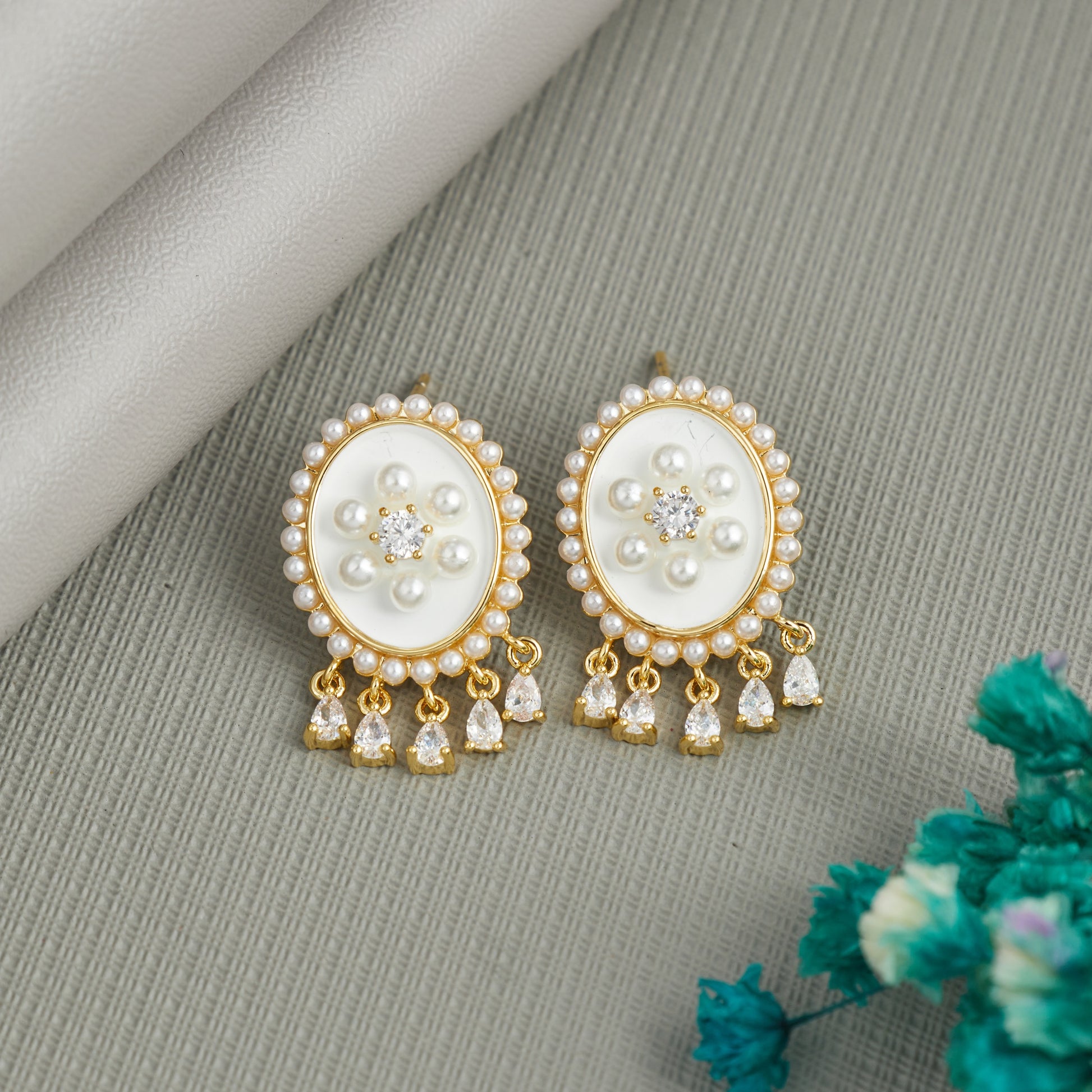 White Pearl Floral Drop Earrings with Gold Finish for Women & Girls